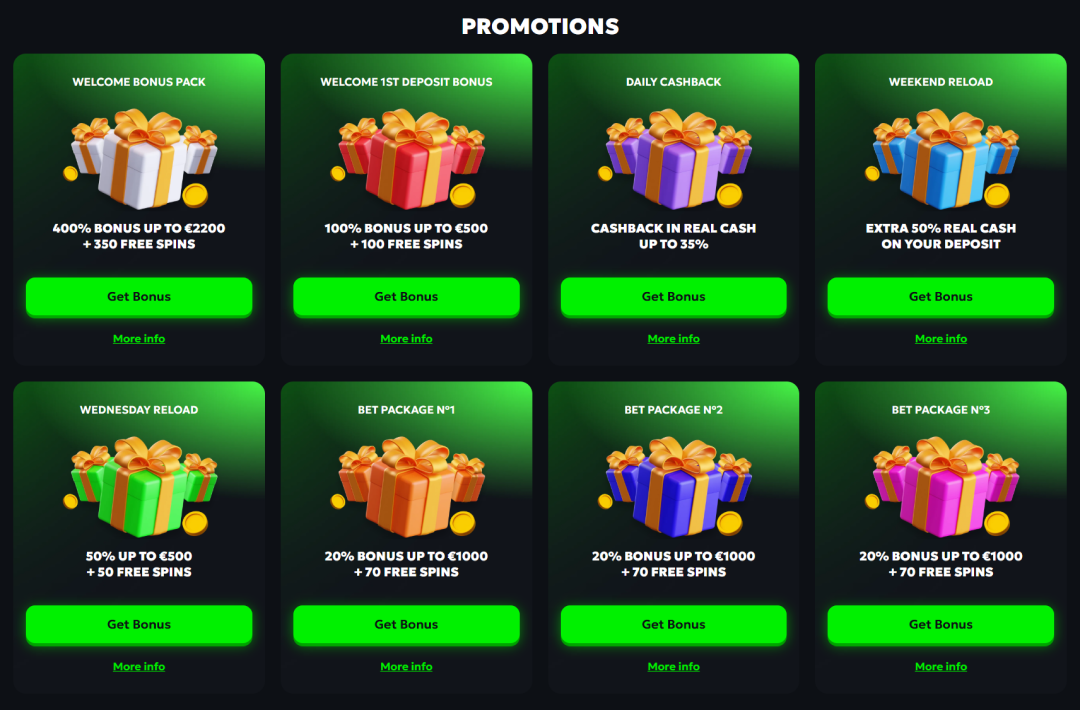Promotions cover both new and returning players, with simple terms and headline perks. The welcome bundle stretches across several deposits and adds free spins for popular slots. Daily cashback can reach 35% and is paid in real cash, while weekend reloads promise an extra boost for regular sessions.